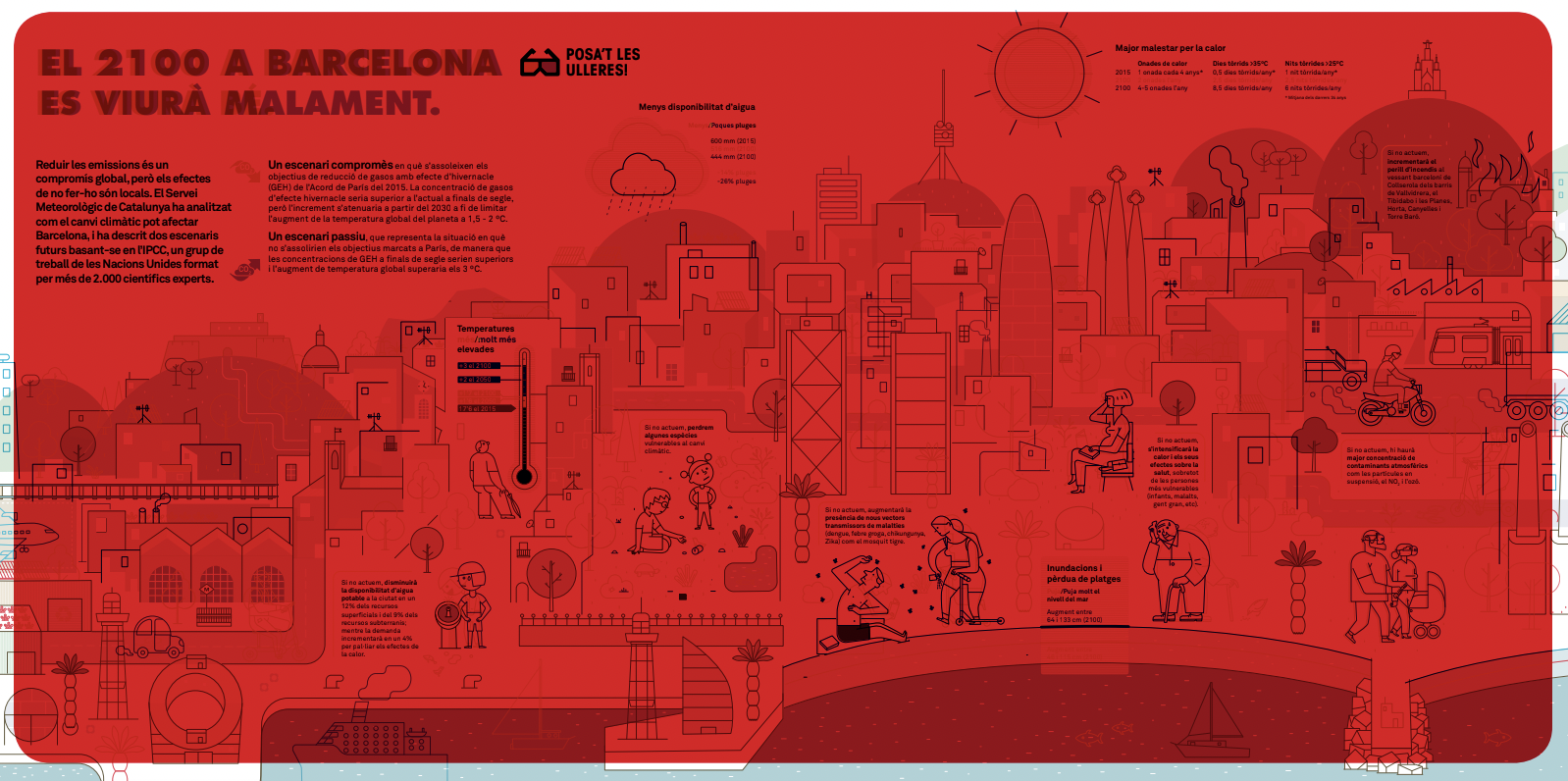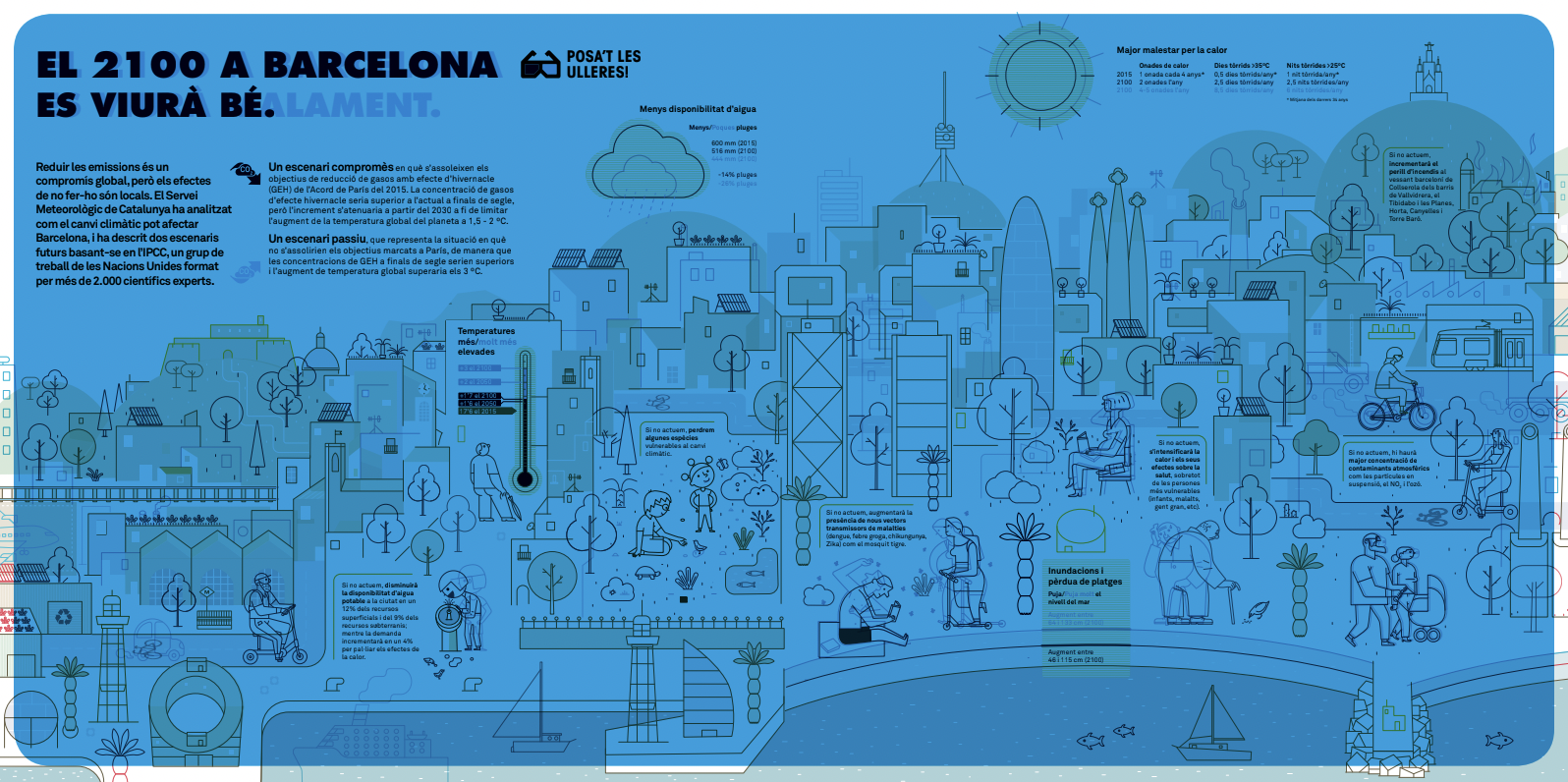 En 2100, en Barcelona, se vivirá bien o mal? Depende de lo que hagamos ahora. En esta ilustración se superponen los dos escenarios: el optimista (comprometido) y el pesimista (pasivo). Con unas gafas se puede diferenciar entre los dos escenarios.