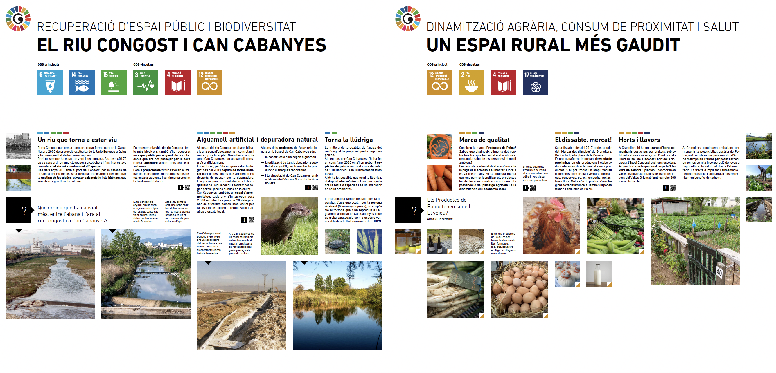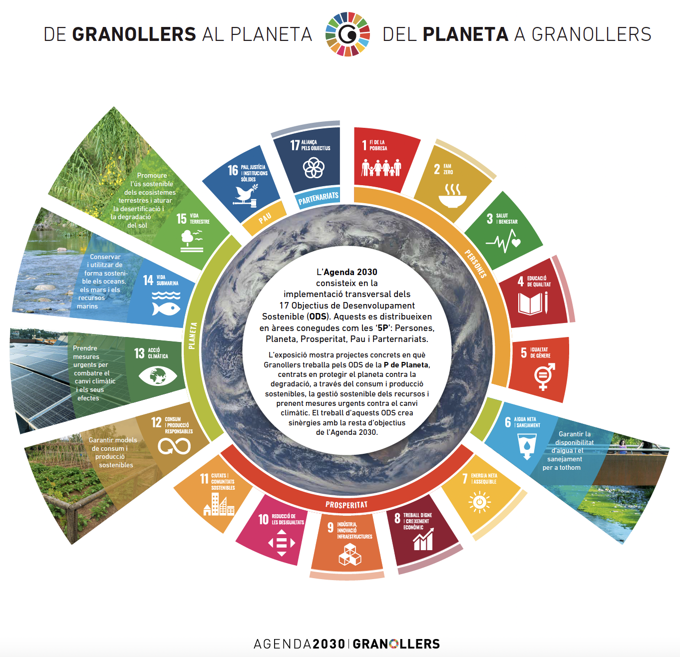 La exposición muestra lo que se está haciendo en Granollers en clave de sostenibilidad ambiental, con proyectos como la recuperación del Río Congost, la dinamización de Palou, la promoción de las energías renovables, o los proyectos de economía circular. Además permite descubrir qué son los ODS y cómo ya se están aplicando en el día a día con acciones como: reciclar, comprar con bolsa de ropa, ir andando o en bicicleta al trabajo, a comprar o a la escuela, etc.