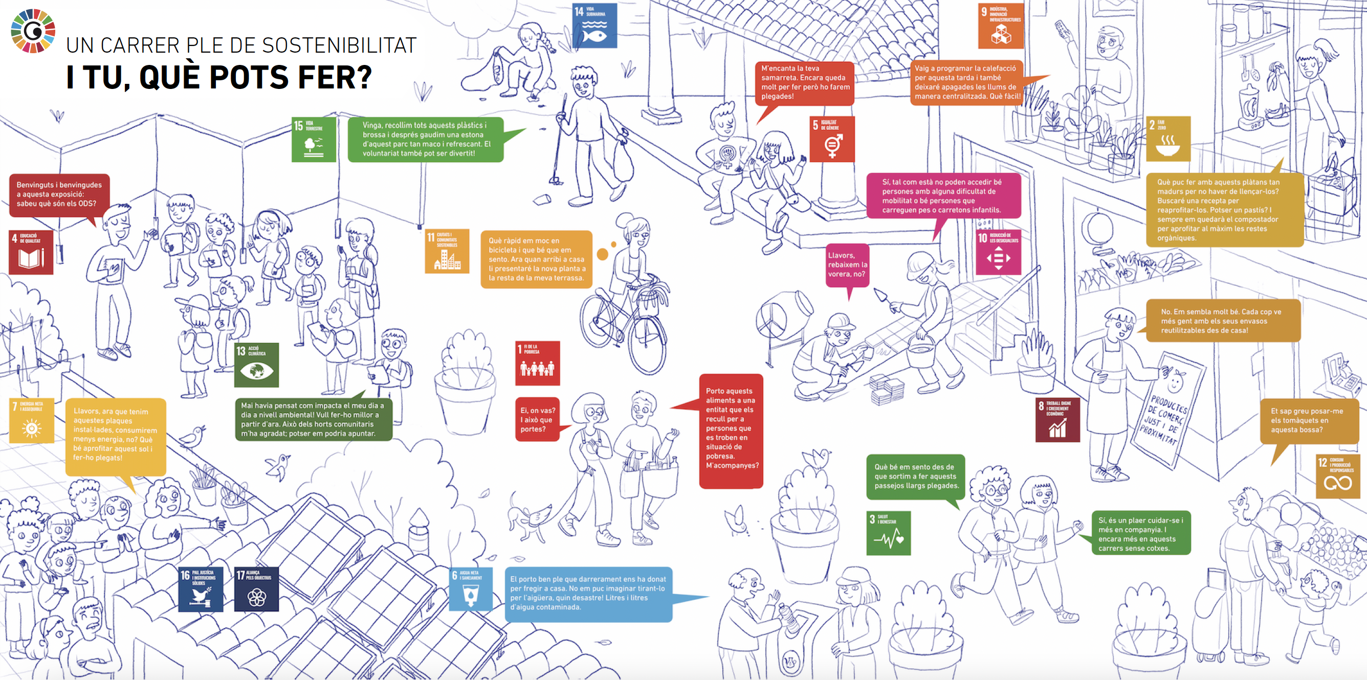 En este caso se optó por dibujar una calle de Granollers y ubicar diversas situaciones que hagan posible entender los ODS en un contexto más cotidiano. Se mantuvo la imagen sin color para destacar los ODS y sus colores característicos.