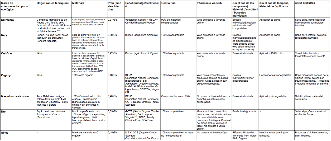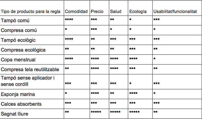 Parlar d’alternatives sostenibles a les compreses i tampons va més enllà d’analitzar i comparar productes segons la seva bondat ambiental i altres criteris (vegeu Taula)[3] , tot i que ho hem fet. El resultat és el següent valorant comoditat, preu, sostenibilitat, usabilitat i salut: 1. Sagnat lliure/ 2. Copa menstrual/ 3. Tampó ecològic/ 4. Calces absorbents i compreses de tela/ 5. Tampó comú i tampó sense aplicador/ 6. Esponja marina / 7. Compresa ecològica / 8. Compresa comú. Tot i aquests resultats, si preguntes al teu voltant, moltes dones fan servir el darrer mètode, la compresa comú, compaginat amb tampons. No moltes fan servir les opcions similars però ecològiques, però el que sí sembla és que cada cop més dones s’estan apuntant a la copa menstrual. El sagnat lliure és, de moment, desconegut i genera moltes reticències. Tot arribarà.