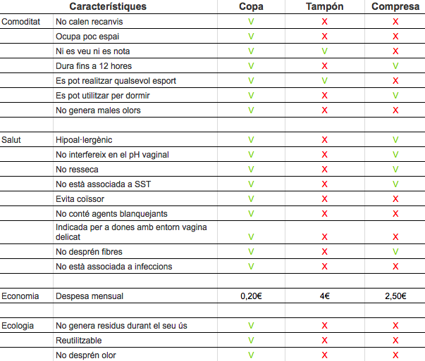 Comparativa de les opcions per a la higiene femenina. Font: Elaboració pròpia a partir de consultes, recerca i pròpia experiència.