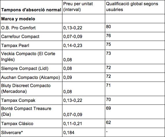 Comparativa de tampons convencionals existents al mercat, destacant el seu preu per unitat i la qualificació segons les usuàries consultades. Font: OCU (desembre, 2016). * Revista Consumer. No es compta amb la valoració de les usuàries.