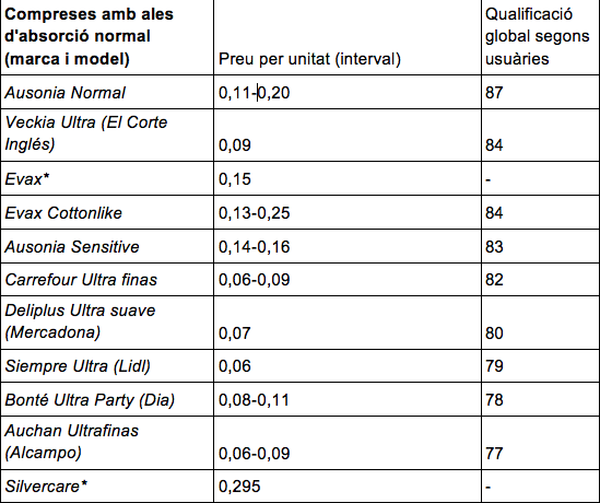 Comparativa de compreses convencionals existents al mercat, destacant el seu preu per unitat i la qualificació segons les usuàries consultades. Font: OCU (desembre, 2016). * Revista Consumer. No es compta amb la valoració de les usuàries.