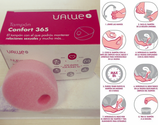 El tampó sense aplicador i sense cordill consisteix en una espècie d’esponja que inclou un gel lliscant asèptic i una obertura per facilitar la seva extracció. Té una capacitat d’absorció de 8 hores i és d’usar i llençar. Cada caixa en conté 3 unitats i el preu total és d’uns 6 euros. Dos euros cadascun! No acabo d’entendre ben bé l’objectiu d’aquest producte: poder tenir relacions sexuals mentre es té la regla? Jo crec que això es pot fer igualment, no? Potser no resulta tan ‘net i polit’ però és que la sang no és bruta, és sang, la nostra sang! I a qui no l’agradi, doncs que no miri. Només faltava que haguéssim d’estar ‘accessibles’ i perfectes les 24 hores del dia, els 365 dies de l’any, i a més, sense tacar.