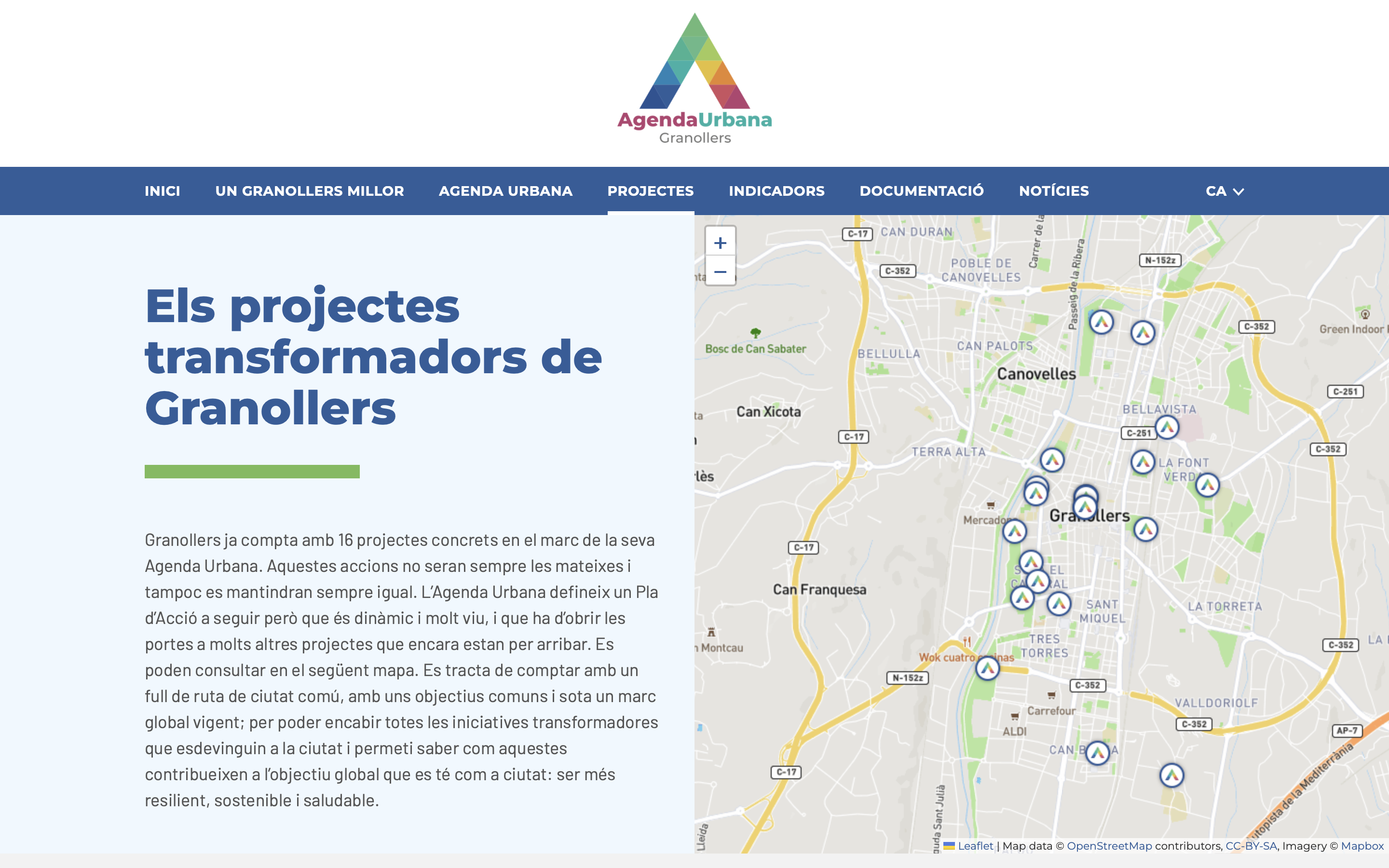 Imatge del nou web de l'Agenda Urbana de Granollers amb els projectes transformadors ubicats en un mapa.