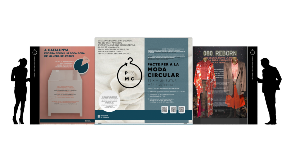 Per explicar aquest Pacte així com la importància de canviar l’actual model de la indústria de la moda, vam treballar conjuntament amb l’Agència de Residus un estand a ubicar en les instal·lacions de la 080 Fashion Week. L’encàrrec va ser concebre, dissenyar i produir l’espai (i aquí vaig comptar amb Freewindi Design) i crear els continguts. A més, tot allò produït havia de ser reutilitzable i itinerant. El resultat va ser un estand on es concentrava el per què cal canviar el model actual de la indústria de la moda (amb relat i dades locals i internacionals) i com fer-ho (on el Pacte i la visió circular de la moda eren el punt central).